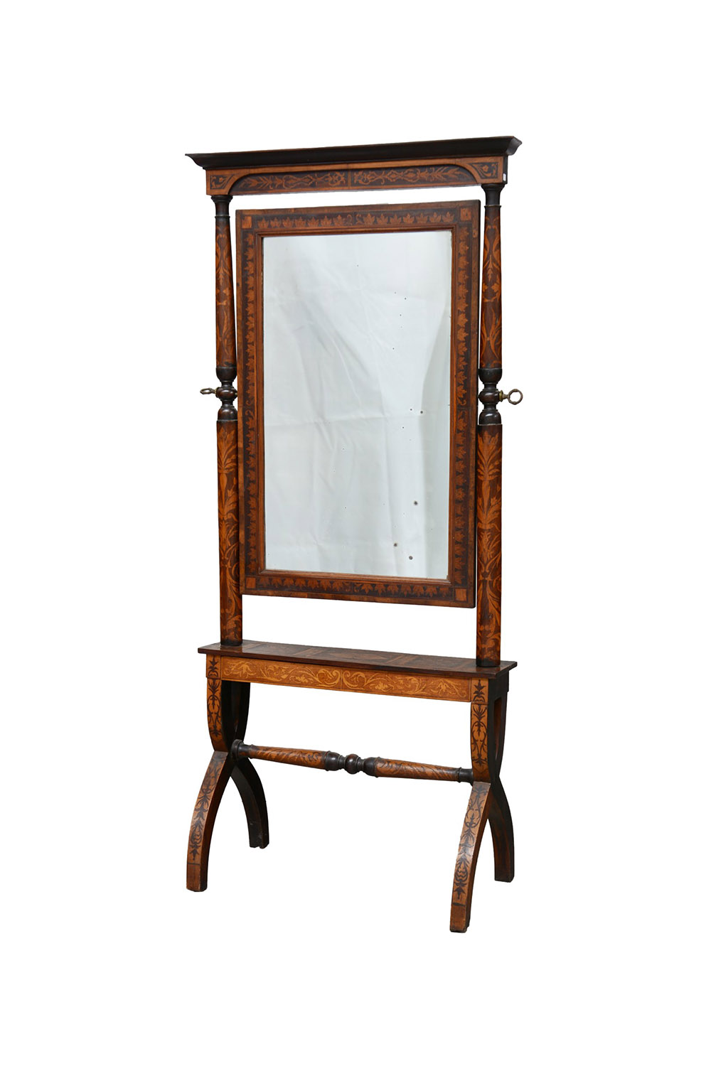Grande psiche impiallacciata in noce e decorata con tarsie in legno dolce a...