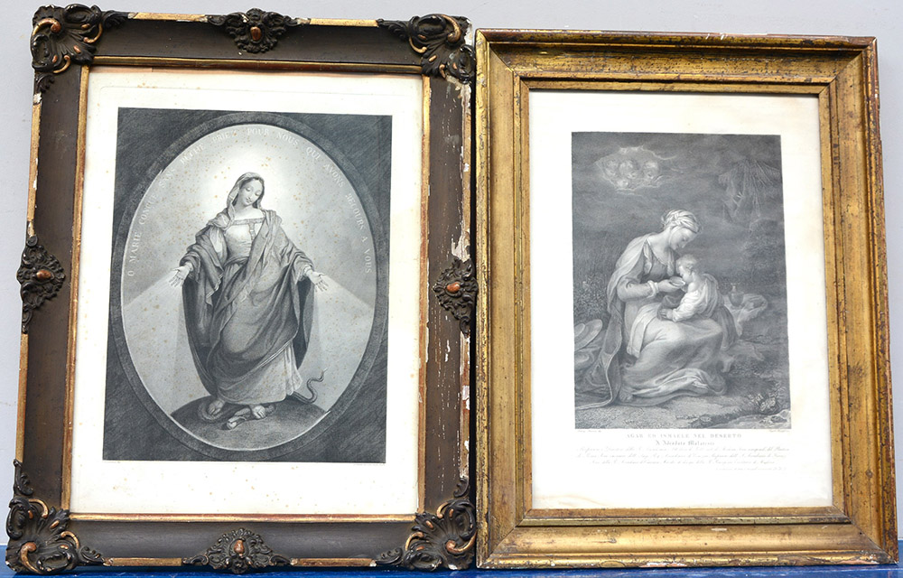 Lotto di due litografie del secolo XIX raffiguranti Maria e Agar ed Ismaele, misure diverse, in cornici (difetti)