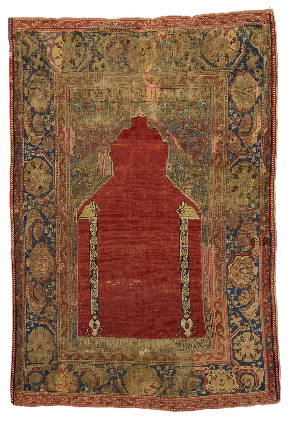 Tappeto preghiera Transilvano Anatolia, sec. XVIII, fondo del Mirab rosso con colonne e versatoi (cm 170x120) (gravi difetti) Transylvanian prayer rug. Anatolia, 18th century (major defects)