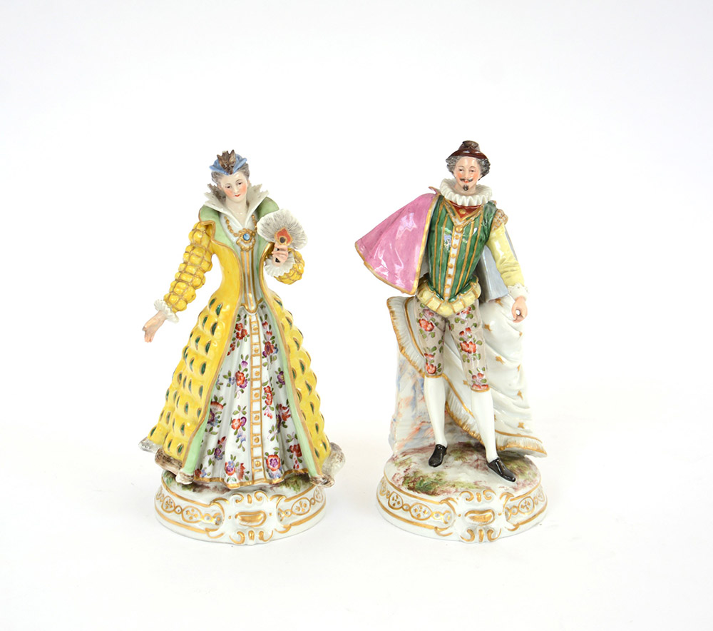 Coppia di statuine in porcellana decorate in policromia raffiguranti dama e cavaliere in abiti rinascimentali. Marca di fabbrica. Germania, sec. XX (h. cm 26) (difetti)