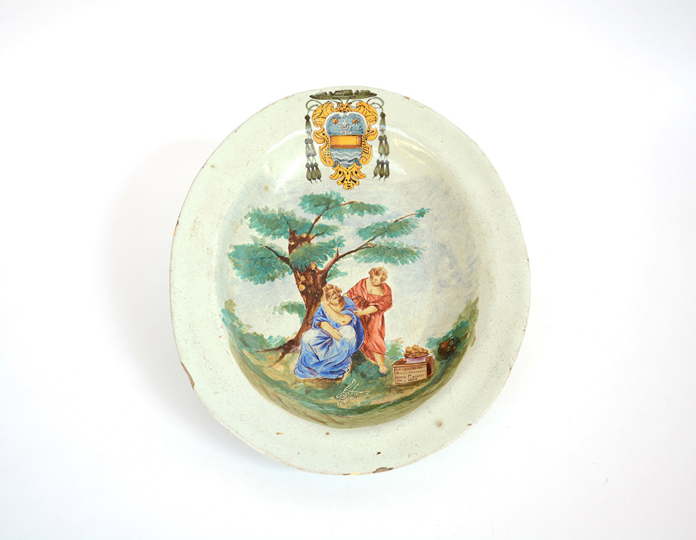 Piatto ovale istoriato in terraglia smaltata con stemma cardinalizio (cm 32,5x40) (difetti)