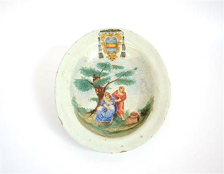 Piatto ovale istoriato in terraglia smaltata con stemma cardinalizio (cm...