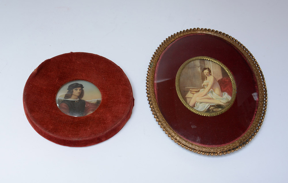 Lotto di due miniature raffiguranti nudo di donna e nobiluomo, autori e misure diverse, in cornici (difetti)
