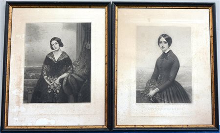 Lotto di due litografie francesi raffguranti gentildonne (cm 59x47 il folio) in cornici (difetti)