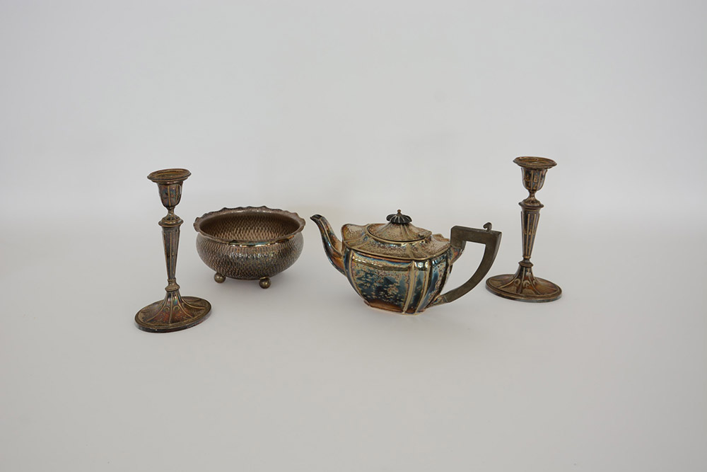 Lotto composto da una teiera, due candelieri e una ciotola in metallo argentato