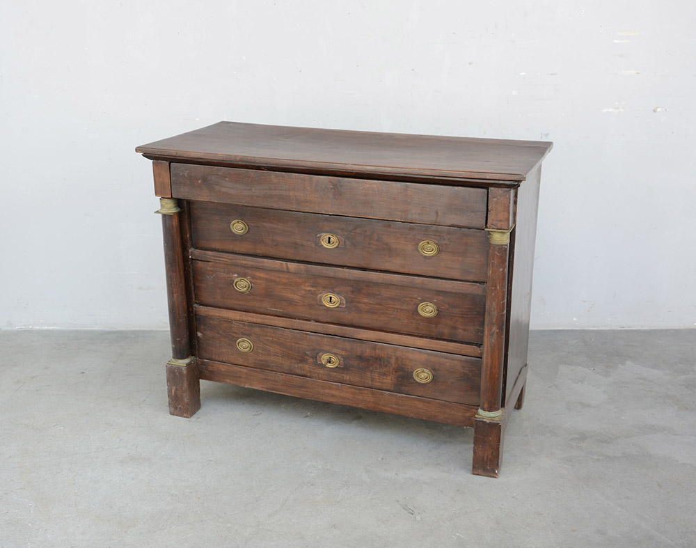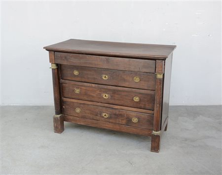 Comò Impero a tre cassetti e mezzo con montanti a piena colonna decorate con capitelli in bronzo dorato. Gambe squadrate. Sec. XIX (cm 114x88x52) (difetti)