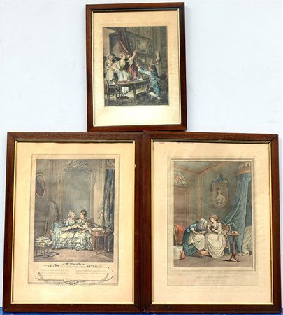 Lotto di tre antiche incisioni francesi a colori raffiguranti scene di genere, misure differenti, in cornici (difetti)