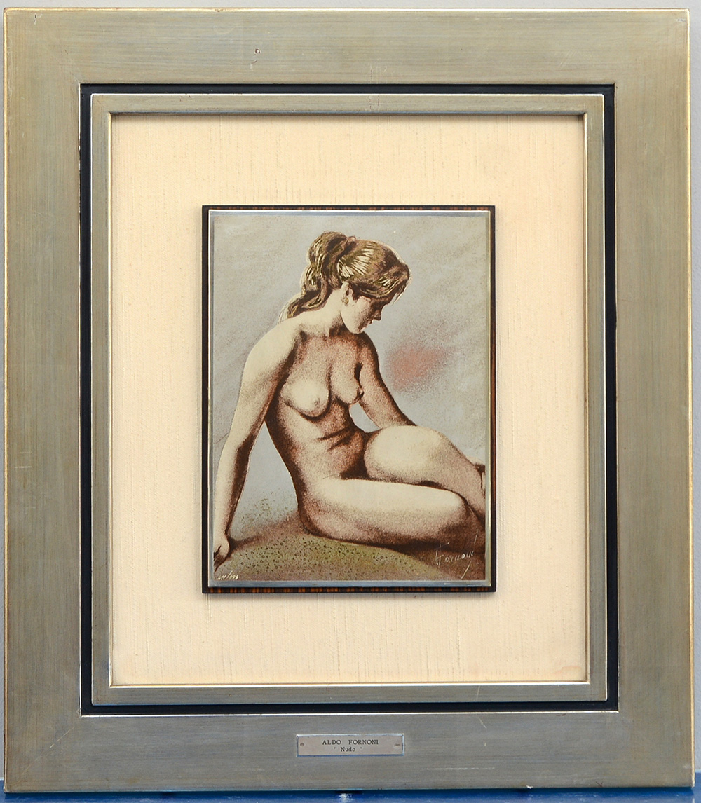 Aldo Fornoni Milano 1916 "Nudo" multiplo su lastra d'argento (cm 24x18) firmato e numerato 411/999 in basso. Certificato di garanzia Wenk al retro. In cornice.