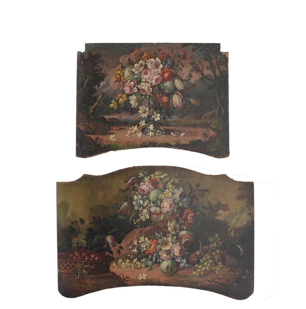 Due sovrapporte con trionfo di fiore en plein air del secolo XVIII, olii su tela in telaio sagomato (cm 65x100 e cm 59x77)