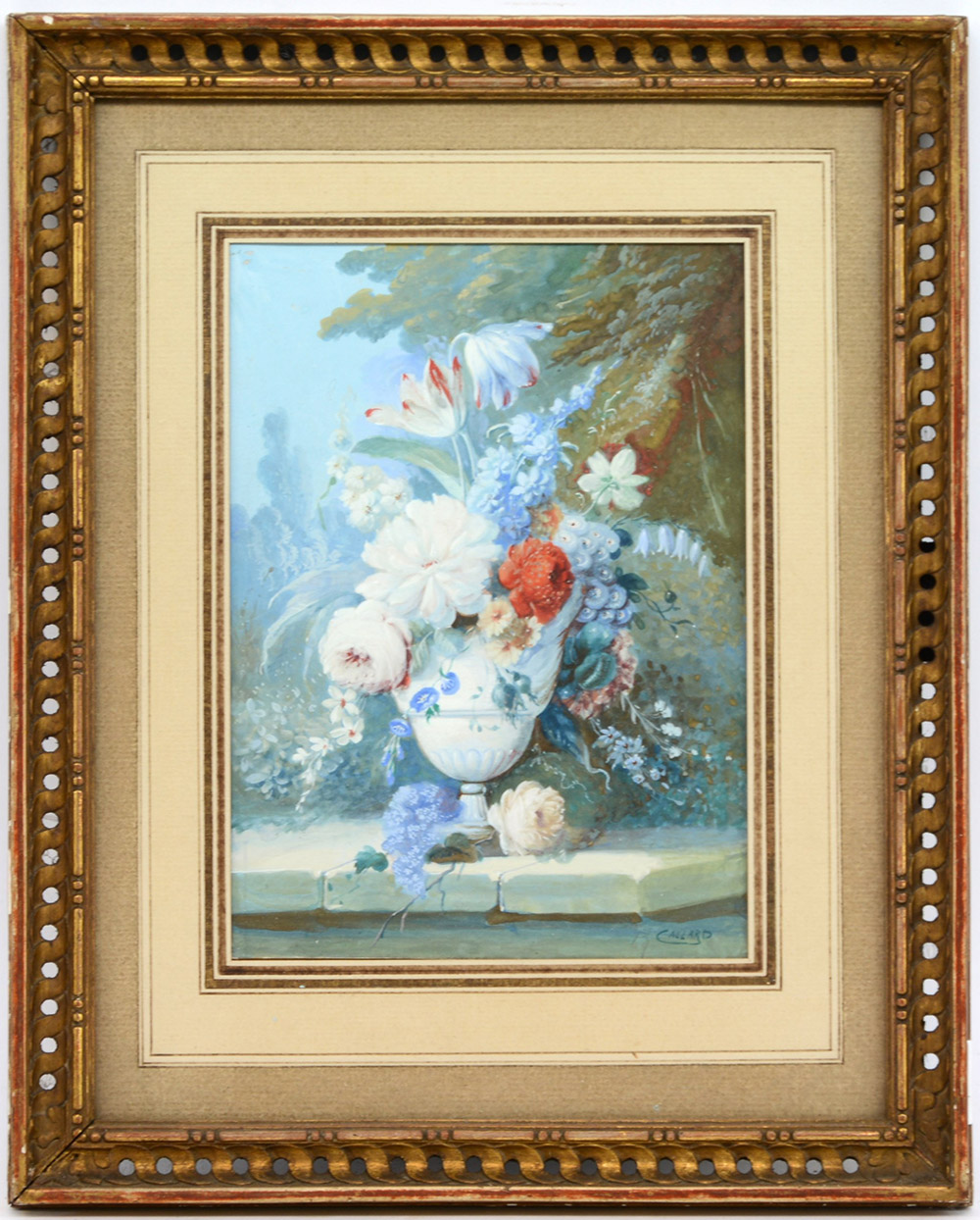 Callard, sec. XIX "Vaso fiorito" acquarello e tempera su carta (cm 20x14) Firmato in basso a destra. In cornice dorata e traforata