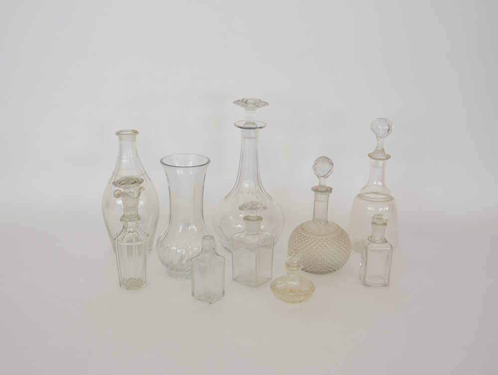 Gruppo di dieci fra bottiglie e vasi in vetro e cristallo incolore (difetti)