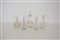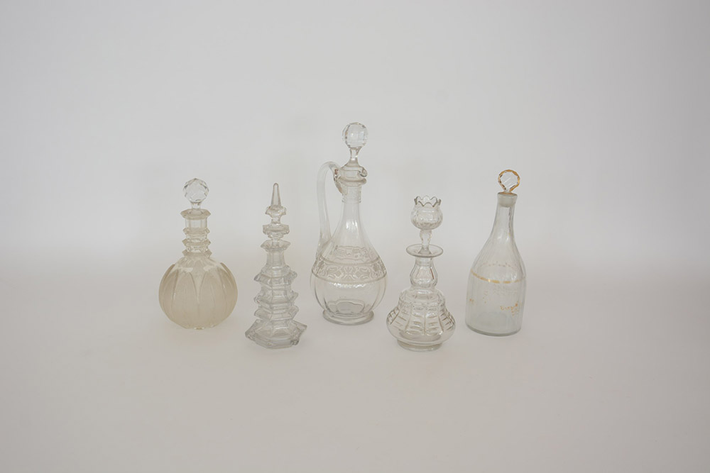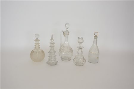 Gruppo di cinque bottiglie di diversa fattura in vetro e cristallo (difetti)