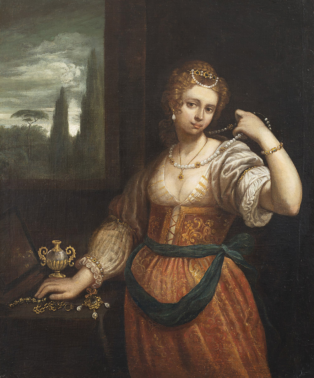 Maestro nordico operante a Venezia nel sec. XVII "Ritratto di gentildonna con collana e gioielli" olio su tela (cm 83x70) In cornice (difetti e restauri)