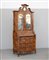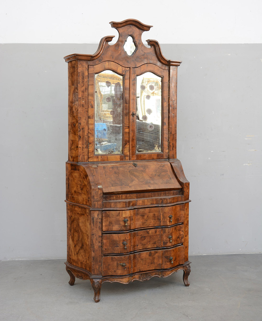 Trumeau lastronato in radica di noce con parte superiore di forma sagomata a specchio. Parte inferiore con anta ribaltabile a tre cassetti (cm 97x210x50) (difetti e mancanze)