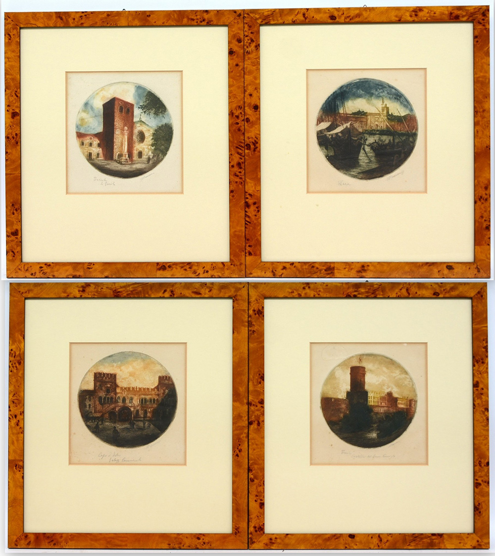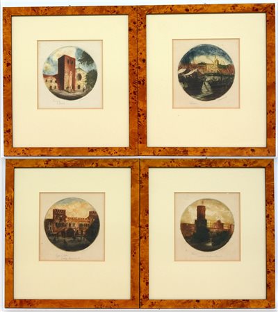 Gruppo di quattro acquaforti a colori raffiguranti paesaggi. In cornici