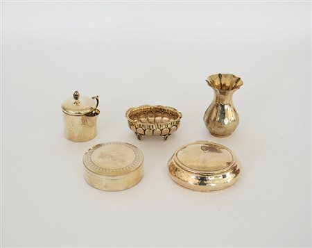 Lotto composto da una salsiera, un vasetto, una saliera e due scatole in argento. Italia, sec. XX (gr 540 ca.) (lievi difetti)