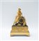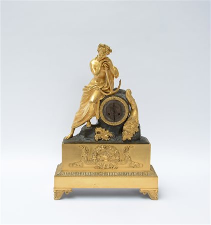 Pendola in bronzo dorato raffigurante l'allegoria dell'abbondanza, composta da una figura femminine con un'ancora seduta su roccia nella quale è inserito l'orologio. Quadrante con numeri romani (abrasi), carica settimanale delle ore e delle mezze con suoneria su campanello. Francia, prima metà secolo XIX (cm 38x56x14,5) (difetti, mancante di chiave, campanello e pendolo)