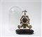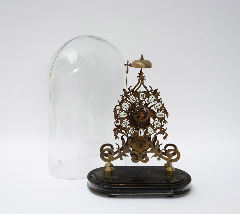 Orologio a pendolo scheletrato con quadrante a numeri romani, contenuto in teca a campana (h totale cm 51) (difetti)