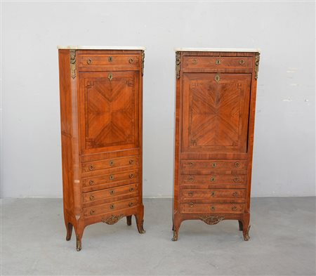 Coppia di secrétaires con fronte a cinque cassetti e un'anta ribaltabile...