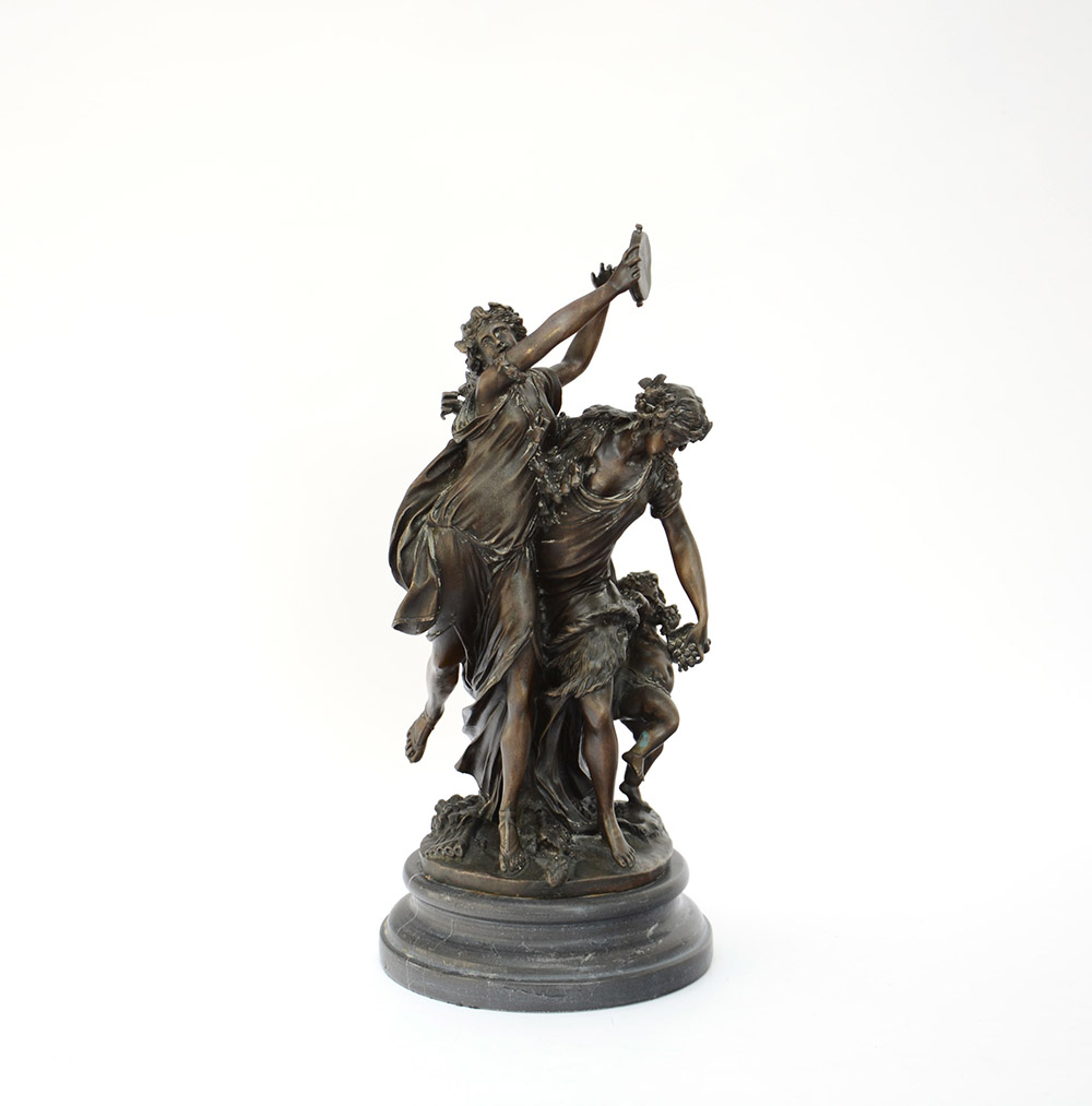 Gruppo plastico in bronzo raffiguranti baccanti su basamento in marmo (h tot cm 59) firmato in basso al retro (difetti)
