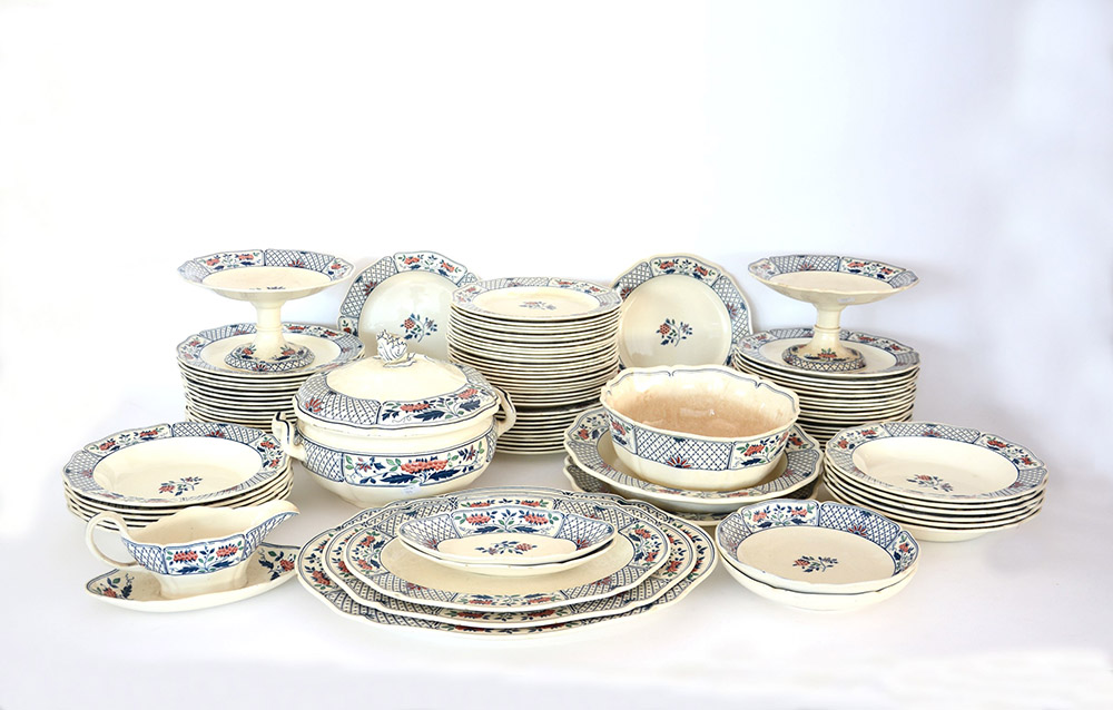 Manifattura di Wedgwood. Parte di servizio di piatti in ceramica decorato in policromia a fiori. Composto da zuppiera, insalatiera, due alzate, cinque piatti di servizio, salsiera e numerosi piatti di diverso uso (difetti)