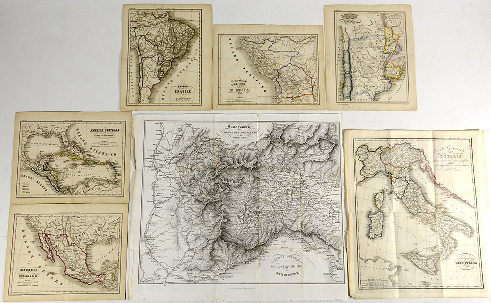 Lotto composto da una carta generale dell'Italia acquerellata, una carta postale del Piemonte (entrambe editate da Artaria), I metà secolo XIX; più cinque tavole acquerellate inerenti l'America centrale e meridionale di Gaspare Martini dello Stato Maggiore editate a Torino nel 1862