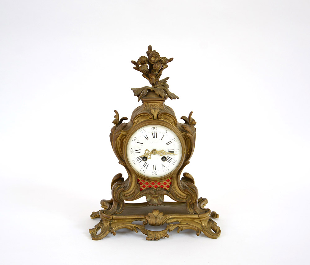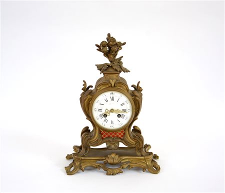 ANONIMO, FRANCIA Pendola in bronzo dorato con mensola incorporata Epoca fine sec. XIX-inizio sec. XX Movimento a carica settimanale, suoneria ore mezze, scappamento ad ancora, sospensione brocot Quadrante in smalto bianco, cifre romane (h. cm 40)