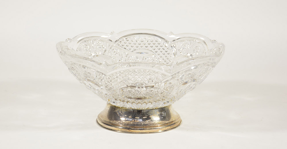 Coppa centrotavola in cristallo molato con base in metallo argentato (lievi difetti)