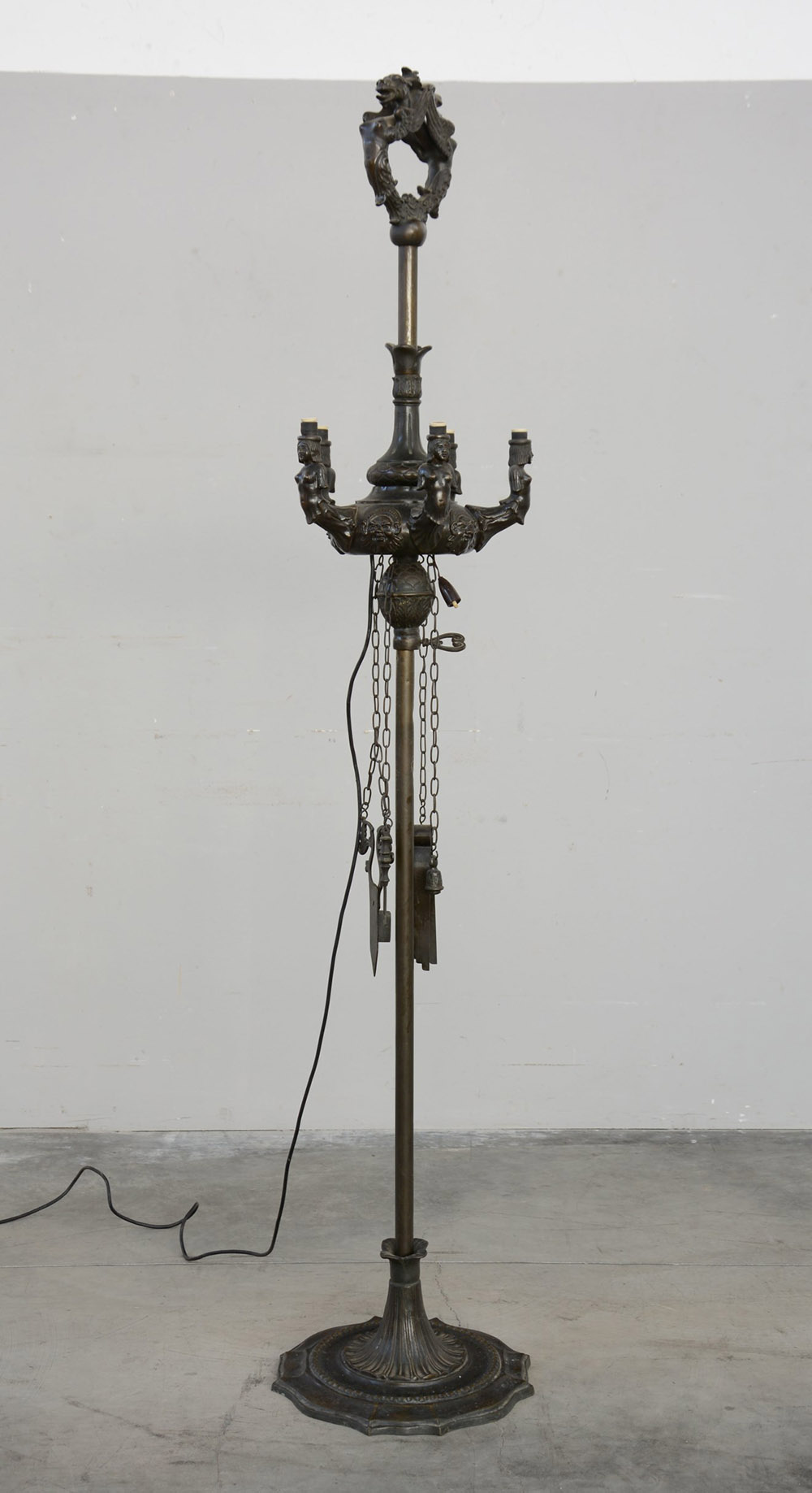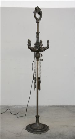 Piantana in bronzo simulante una lampada fiorentina a cinque fiamme con braccia sagomate decorate da mezzi busti femminili intervallati a mascheroni. Base sagomata decorata a foglie d'acanto e bugnature. Montata a luce elettrica (h. cm 180)