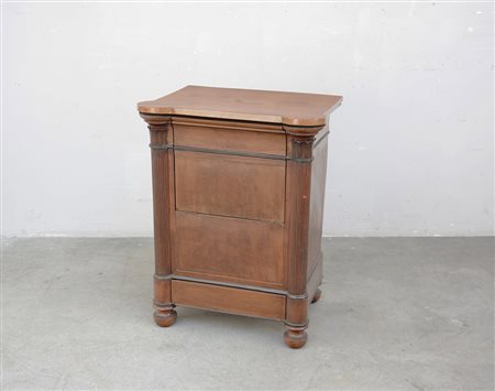 Comoda lastronata con pianetto sagomato apribile e cassetto nella base. Montanti a colonna scanalata intagliata nel capitello a foglie d'acanto. Piedi torniti. Sec. XIX (cm 62x80x46)