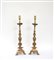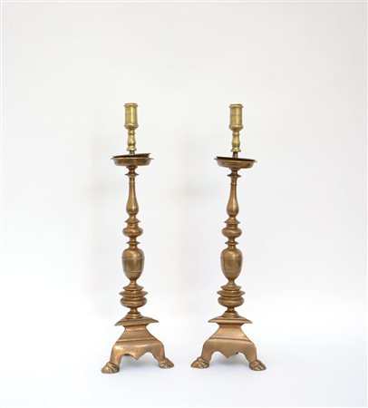 Coppia di portaceri in bronzo con base tripode a piedi stilizzati e colonna tornita a fuso (h cm 62) (difetti)