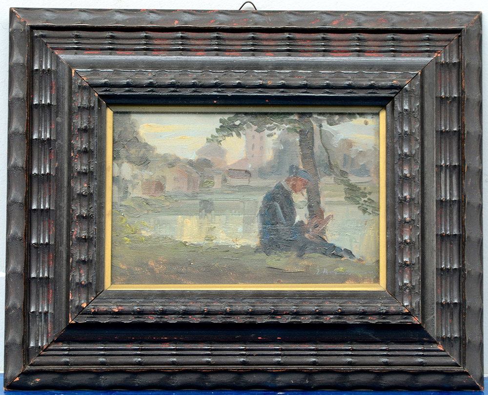Firma indecifrata "Uomo in lettura sulle rive di un fiume" olio su cartone (cm 13x19) firmato in basso a destra. In cornice