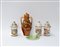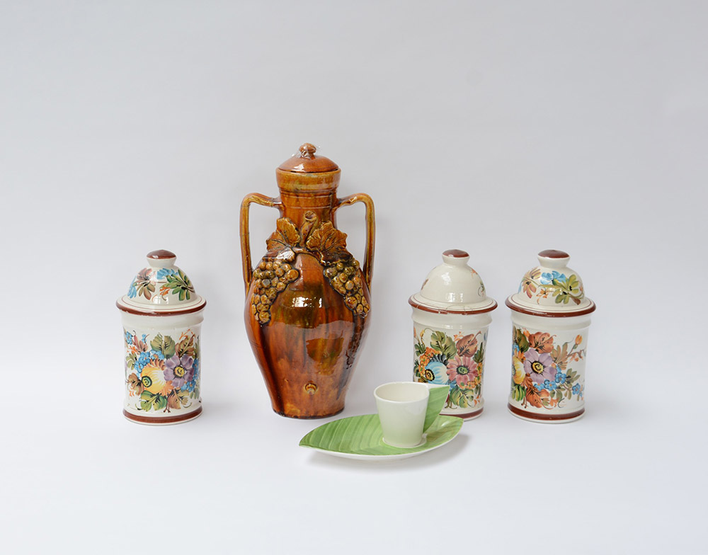 Lotto composto da una tazza con piatto a forma di foglia marcati Villeroy & Boch, tre contenitori in ceramica con coperchio e un'anfora biansata decorata con grappoli d'uva (difetti e restauri)