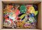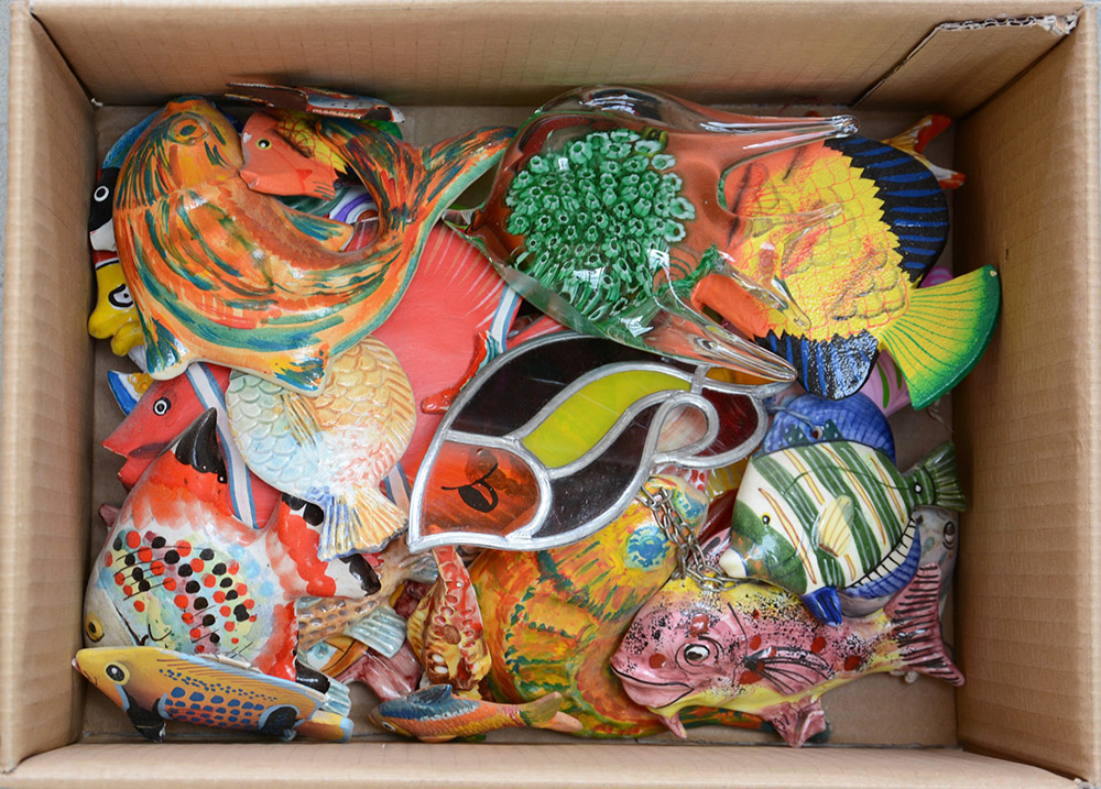 Cartone contenente una collezione di pesci di fatture e materiali differenti (difetti)