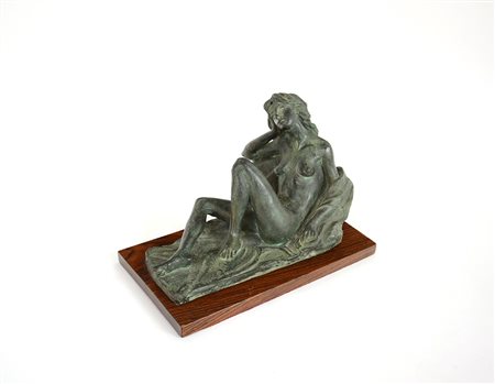 Michele Zappino "Nudo femminile sdraiato", scultura in bronzo patinato (cm 34x20x22) firmata alla base, con supporto in legno