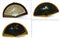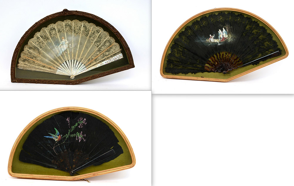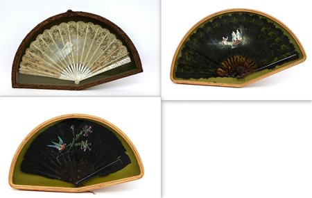 Lotto composto da tre ventagli con pagine in stoffa e piuma contenuti in teche
