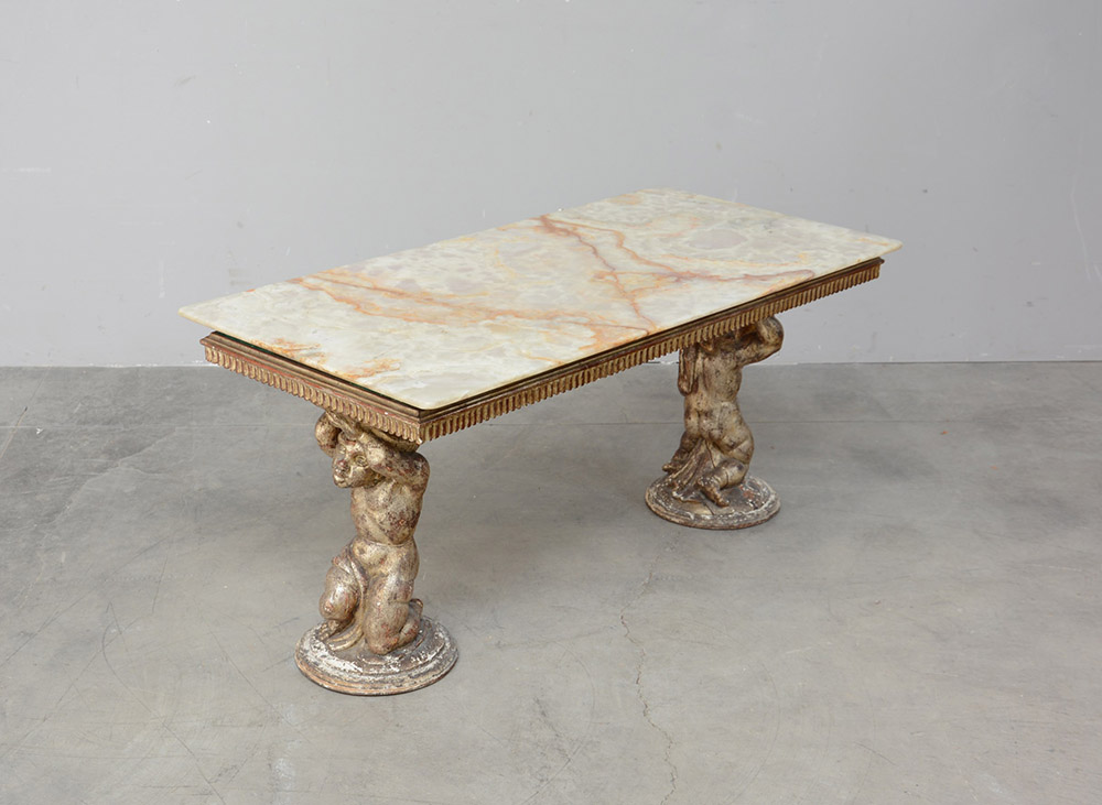 Tavolo da salotto con base in legno dorato e scolpito a mori. Piano in onice (cm 105x49x51) (difetti)