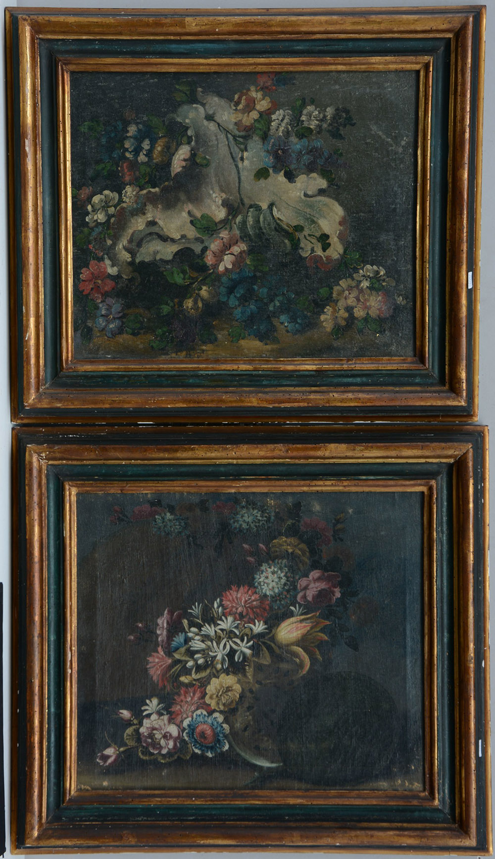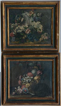Scuola del XVIII e XIX secolo due composizioni con fiori e con fiori, olii su tela, cm 40x50 (difetti)I)n cornice