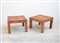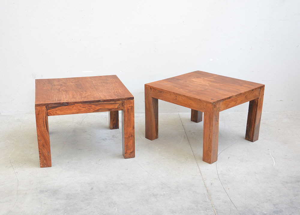 Coppia di tavolini quadrati in legno, piedi a pilastro (cm 70x49x70)