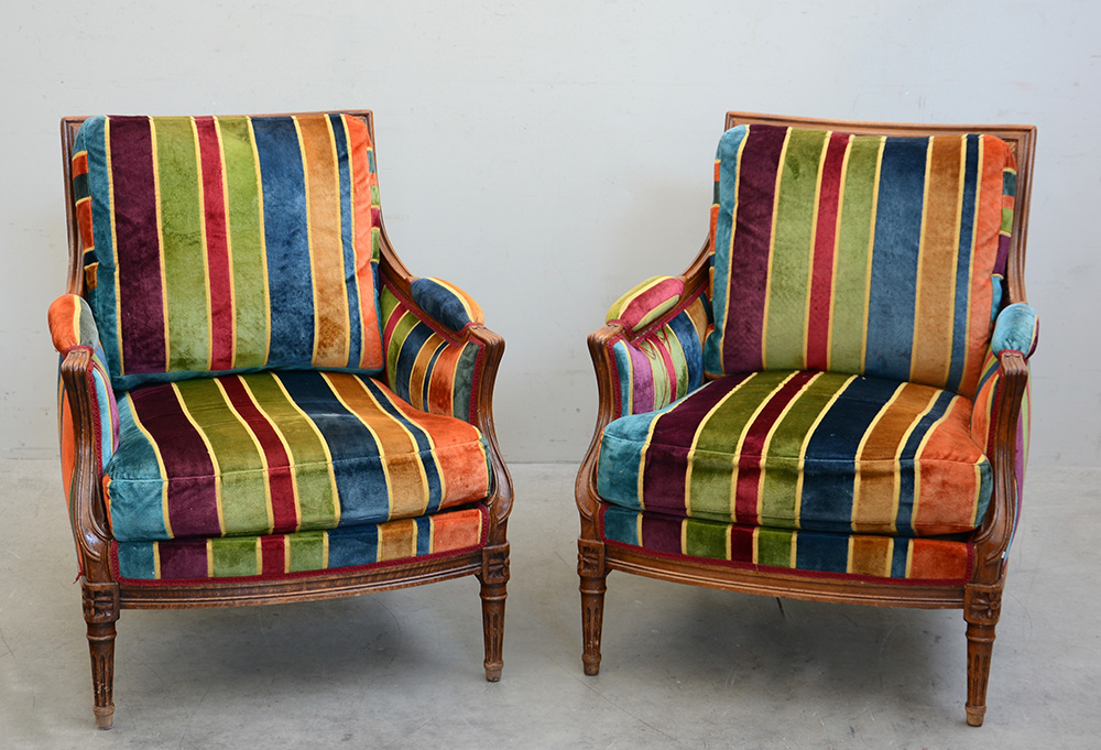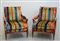 Coppia di poltrone in noce con montanti e gambe scanalate, rivestimento e cuscini in tessuto a righe, schienale in cannettè traforato. (difetti)