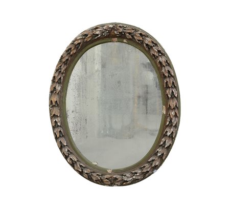 Specchiera ovale in legno intagliato e laccato a foglie d'alloro (cm 95x70) (difetti e mancanze)