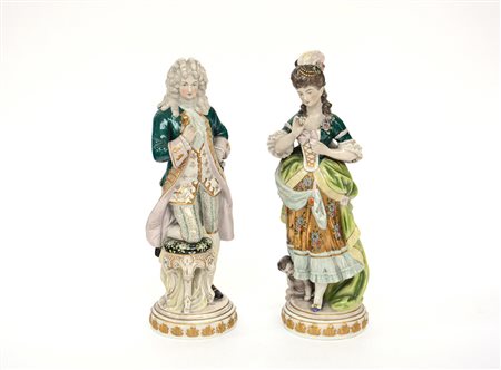 Coppia di statuette in porcellana policroma raffiguranti gentildonna e gentiluomo in abiti ottocenteschi (h. cm 32) (difetti)