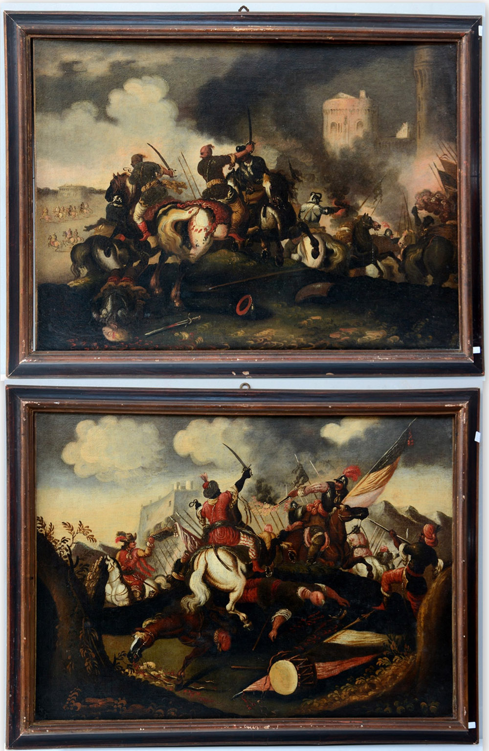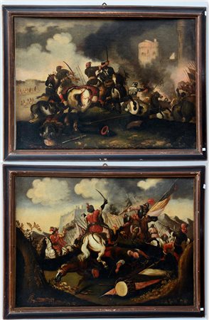 Seguace di Matteo Stom "Battaglie tra cavalieri nei pressi di una fortezza" coppia di olii su tela(cm 73x99)(difetti e restauri) Allegata expertise di Ferdinando Arisi che li attribuisce a Matteo Stom