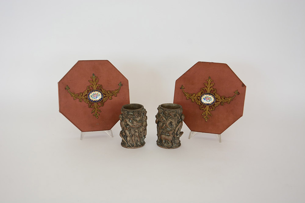 Lotto composto da due vasetti manifattura di Signa e due fregi in metallo dorato e smalti (difetti)