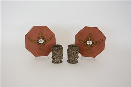 Lotto composto da due vasetti manifattura di Signa e due fregi in metallo...