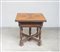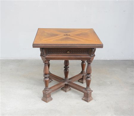 Tavolo da gioco con piano apribile rivestito in panno verde. Fascia a quattro ante intagliate a motivi geometrici. Gambe tornite poggianti su piedi a parallelepipedo riunite da traverse (cm 70x70x70)