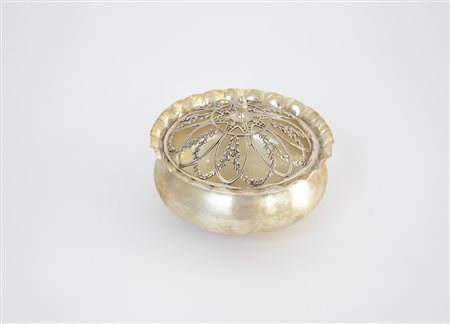 Scatola pot-pourri in argento di forma circolare liscia con coperchio traforato con festoni e motivi stilizzati. Italia, metà sec. XX. In custodia (d cm 17) (gr 540 ca.) (lievi difetti)