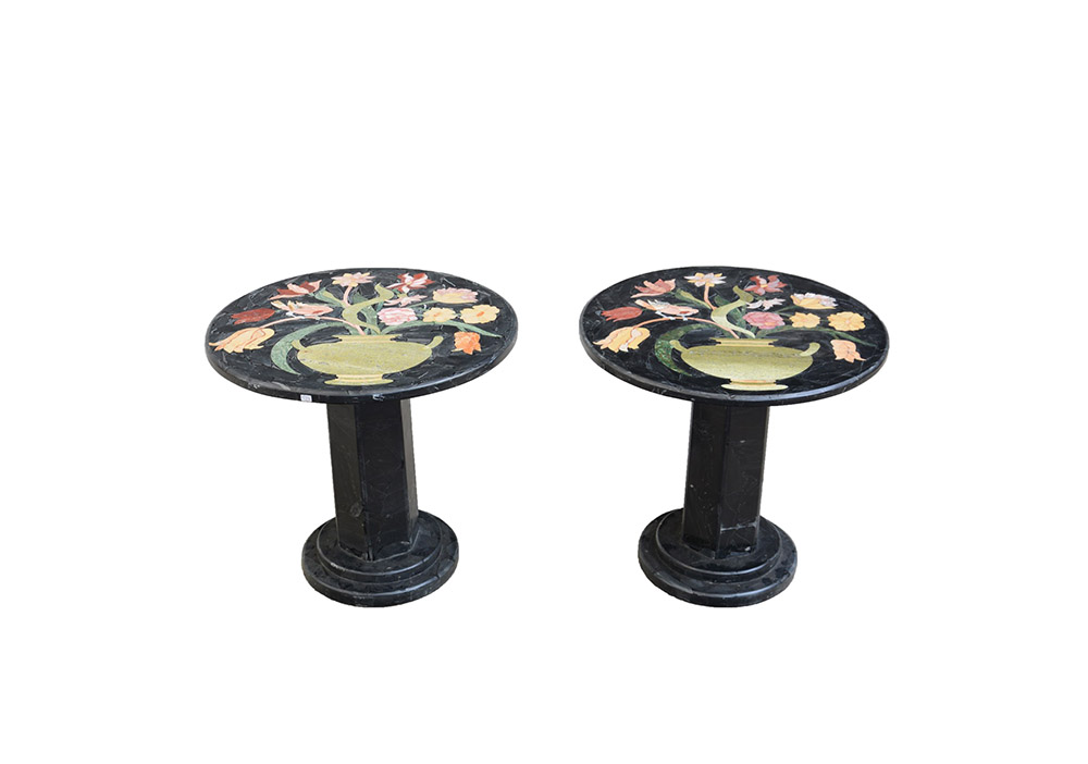 Coppia di tavolini tondi con pianeti decorati in pietre dure policrome a vasi con fiori (d cm 50x h cm 46)(difetti)