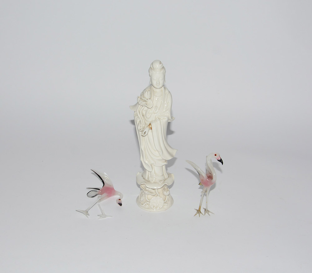 Lotto composto da due sculture in vetro di Murano raffiguranti gru e una statua di manifattura orientale (difetti)