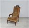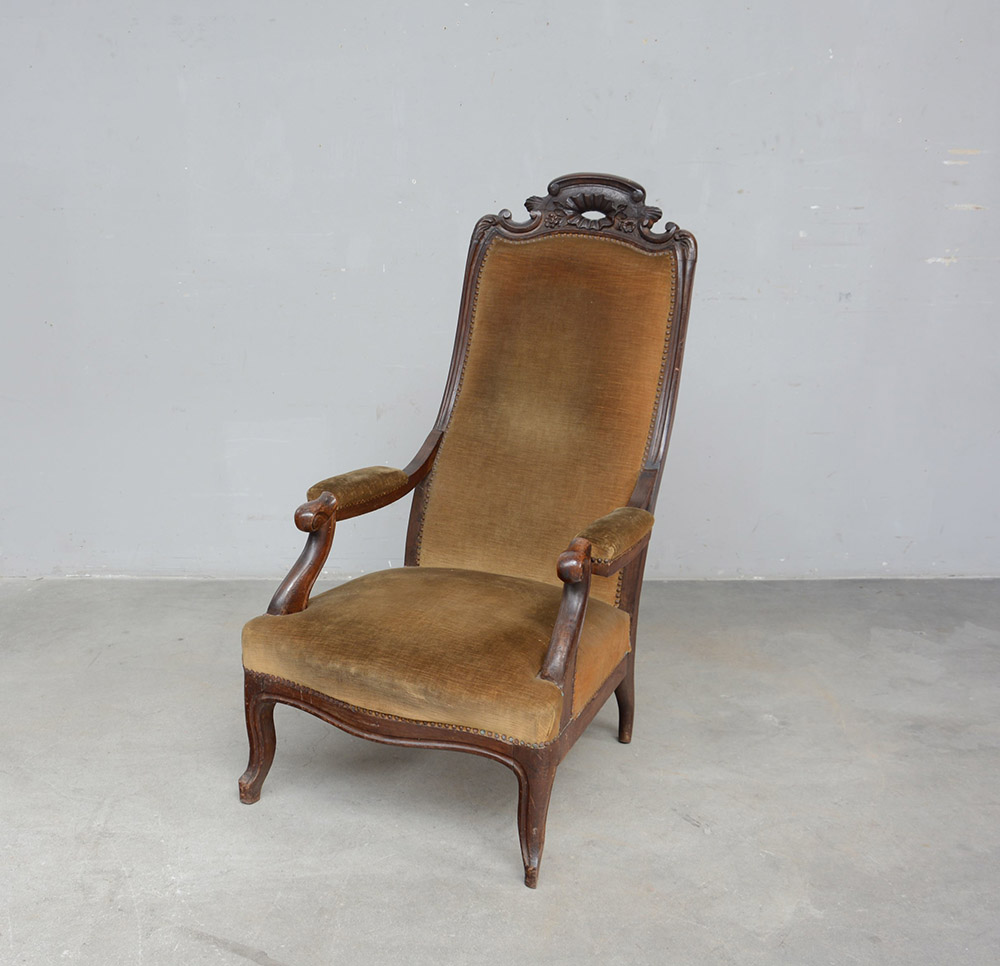 Poltrona in noce con cimasa intagliata e traforata. Braccioli e piedi sagomati. Sec. XIX (difetti)